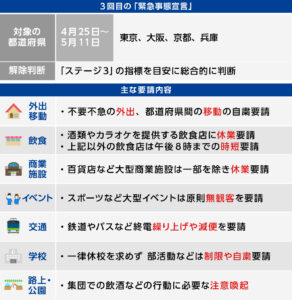 今回の緊急事態宣言は前回に比べ、広い範囲で休業・時短要請の対象となったことと、